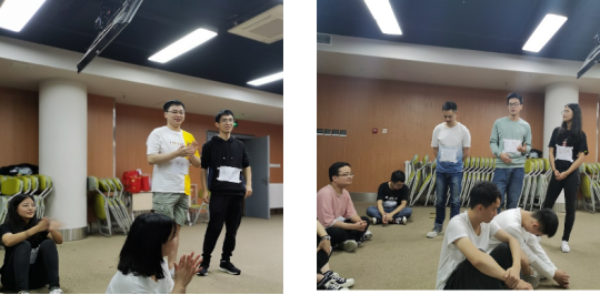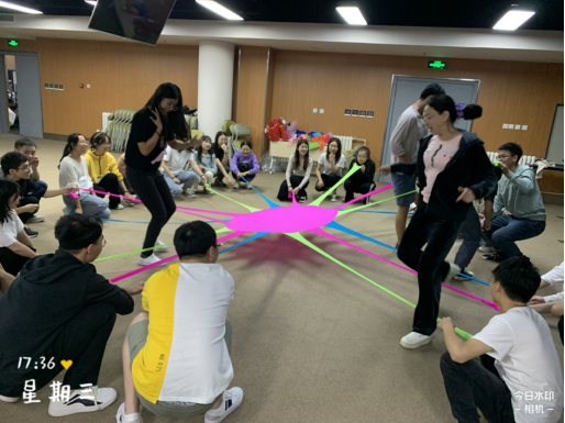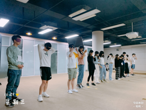 之后进行了“丝带与自觉”“镜子与模仿”“盲人与拐杖”等互动项目,其中,“盲人与拐杖”引发了关于“信任”与“责任”的深刻思考和交流探讨。扮演“盲人”的同学戴上眼罩,在各自“拐杖”的指引下,完成一系列规定的动作,并且期间双方不能通过语言交流。每组同学都顺利完成了任务,默契感迅速提升。在分享环节,同学们积极发表感言,交流心得体会,“盲人”同学直言体会到了温暖与被呵护的感觉,“拐杖”同学则感受到了责任的重要性。