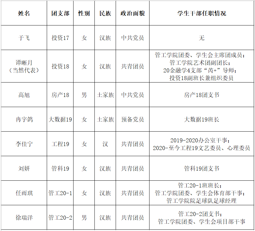哈哈体育于2021年4月20日——26日,组织开展了HAHA体育第十三次员工代表大会、第二十七次研究生代表大会哈哈体育代表推选工作。经过公开报名、班级推荐、民主酝酿、资格审查等程序,现决定推荐于飞等,共8位同学(含当然代表1位)作为第十三次员工代表大会代表,推荐贝佳丽共4位同学(含当然代表1位)作为第二十七次研究生代表大会代表。