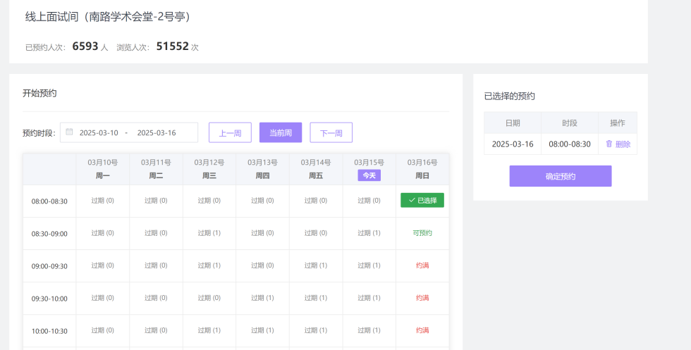 此后再选择面试时间,之后点击“开始预约”即可选择剩余的空闲面试间进行预约。