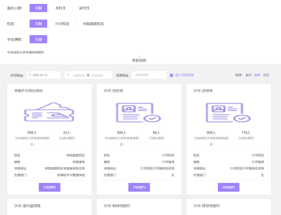 该服务主要应用于公司沙河、公司南路两个校区的面试间申请。点击平台相关栏即可进入预约页面,可以对以下条件进行筛选: