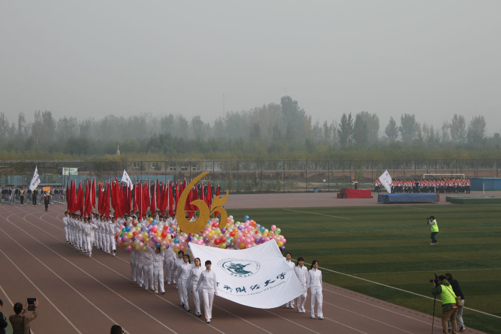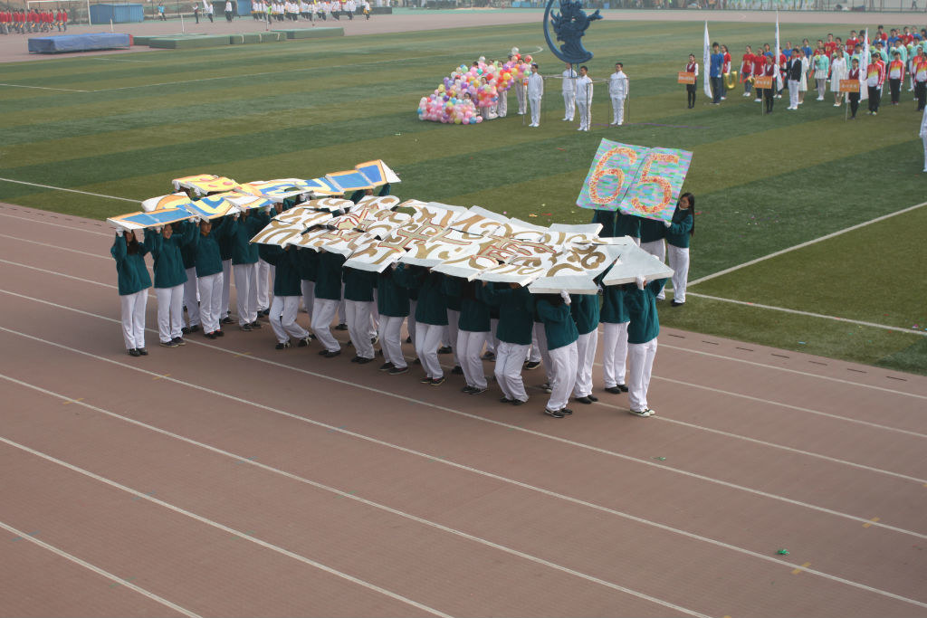 首先出场的是身穿白色运动服的校代表方阵。走在最前方的是高举印有HAHA体育校徽旗帜的女生方队,紧跟的是气球方队,他们中间环绕着巨大的数字65,标志着HAHA体育建校六十五周年。最后走来的是红旗方队——他们矫健的步伐是中财人不断前进的象征,他们坚定的目光是中财人刚毅坚卓的展现,他们飒爽的英姿是中财人精神风貌的代表。