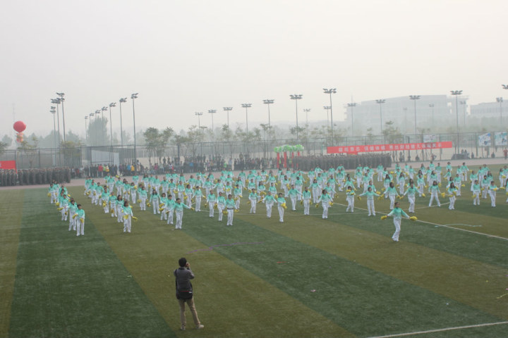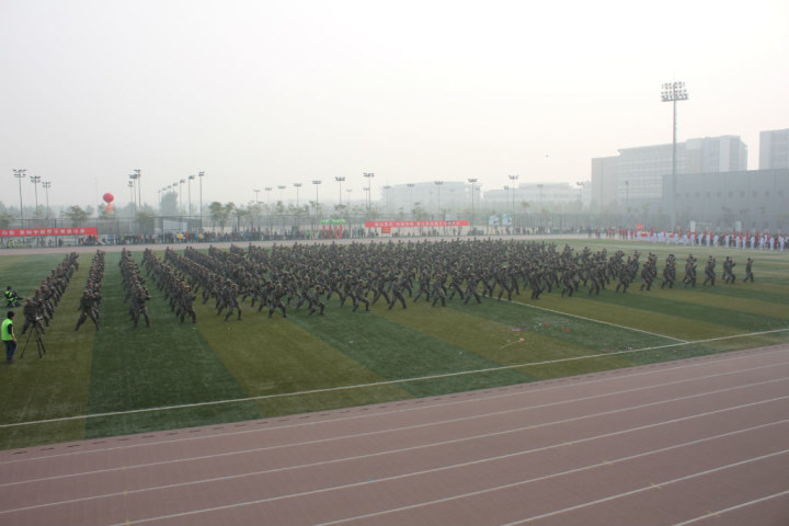 今年的团体操表演可谓一大亮点。表演的第一部分是身着绿色服装的教师表演方阵,当最炫民族风的音乐响起时,观众席上沸腾了!所有人都激动地起立记录下这一难忘的场面——老师们的一颦一笑、每一个转身、每一次跳跃都展示着与平日严肃认真的形象不同的一面。此刻的老师们不再伫立于三尺讲台、她们用舞姿宣示着不一样的年华。掌声雷动、欢呼迭起,这一场看似普通的盛会俨然成了连接师生感情的桥梁,在场的每个人都瞬间成为了怀有无限精力和蕴藏无限的可能的青年。第二部分是刚刚参加完军训的大一新生向全校师生们展示的军体拳,公司今年新生共有182人,其中64人被选派参加军体拳表演。在今天的正式演出之前,他们在课余时间已经排练了多次,而大洼瑟瑟秋风与朦胧的霾都没有成为他们缺席的借口。每个人都用尽全力打好了今天这最后一仗,展现出了中财14级新生雄浑有力的风范。
