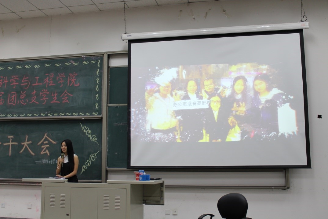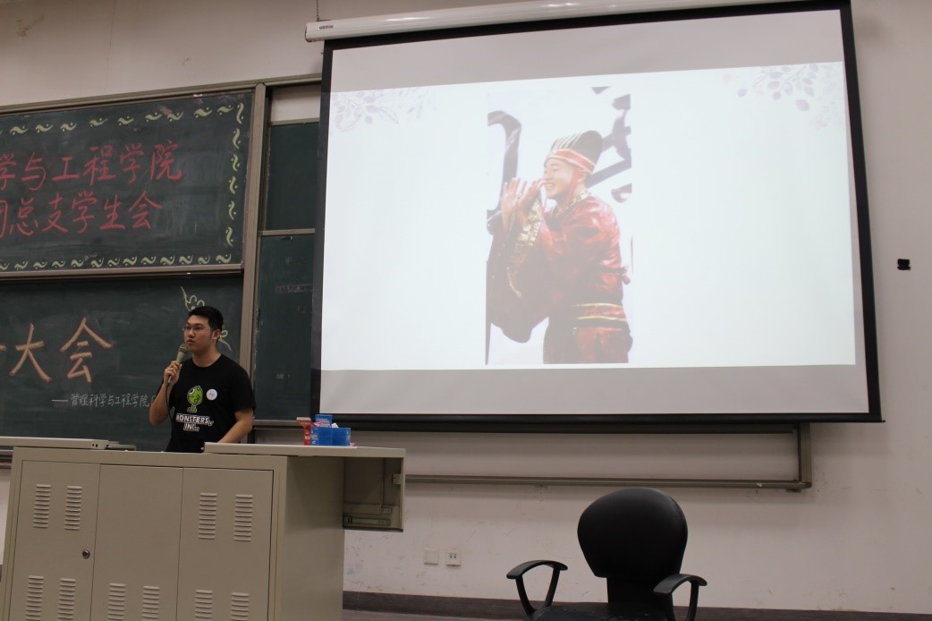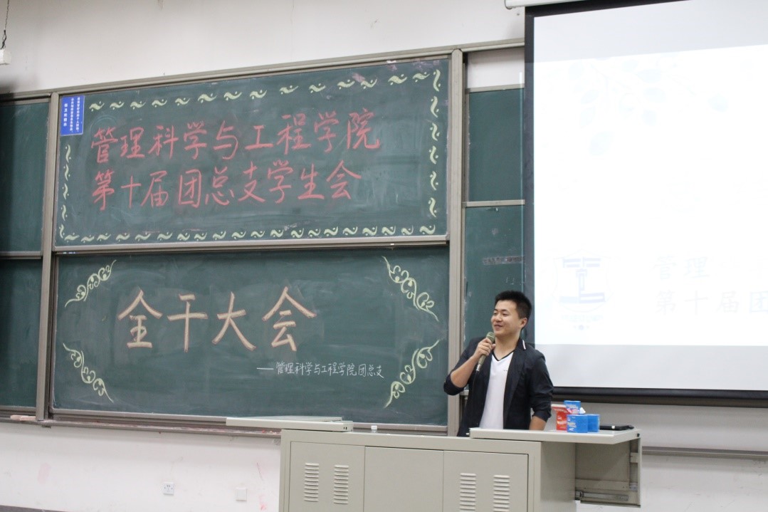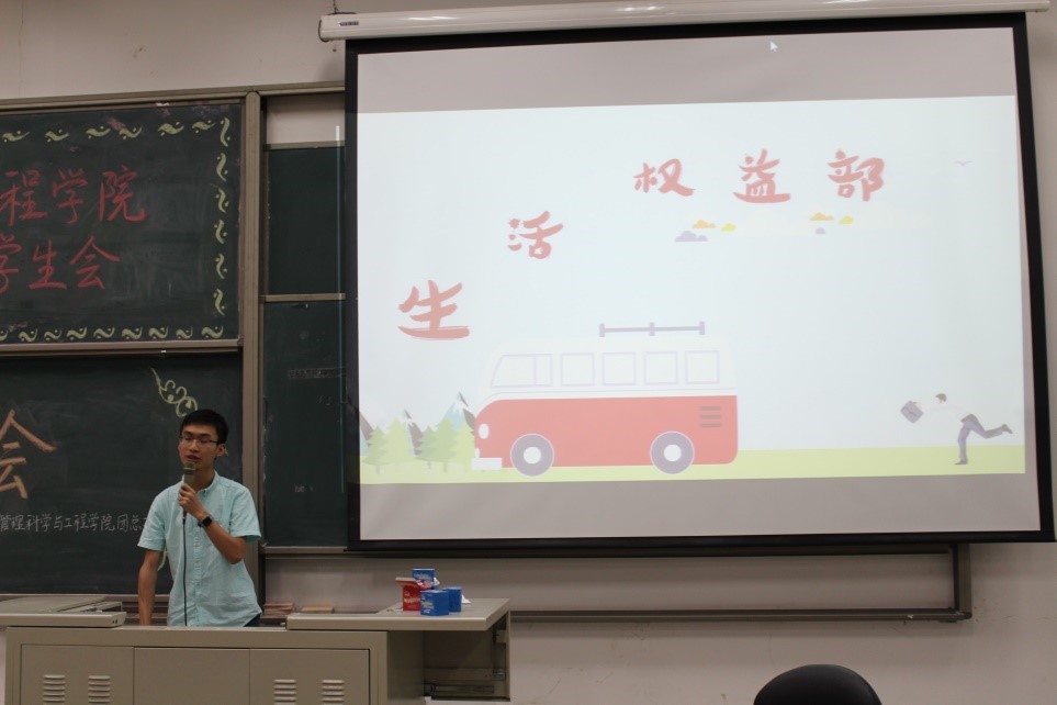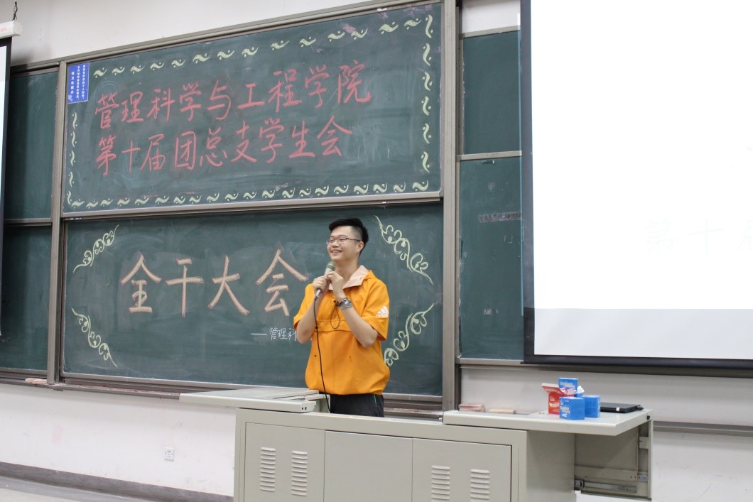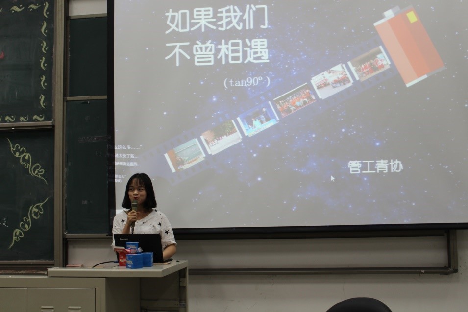 在主持人马铁力风趣幽默的开场过后,第十届主席团代表戴子钧上台发言。他首先提出了一个问题:假如给你一台时光机,让你回到一年前刚刚加入管工员工会的时候,你会做什么——搁下这个问题后,戴子钧展示了一些一年前刚刚进入大学,进入员工会的曾经的“小鲜肉”们当时稚嫩却朴实的感言以及来自学长学姐们的寄语。而后,他又以青协及体育部分管主席的身份对这两个部门的部长干事们传达了自己的叮嘱。说起这一年来在主席团的任职经历,戴子钧感慨万千,值此新老交替的换届之时,他将自己曾经的部长送给自己的“员工会三句诗”送给了台下将继续为了管工员工会奋战下去的各位学弟学妹——