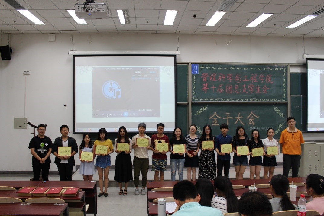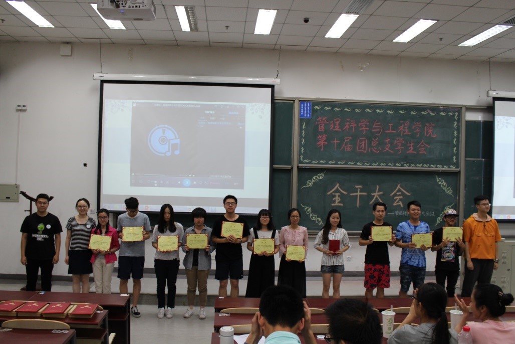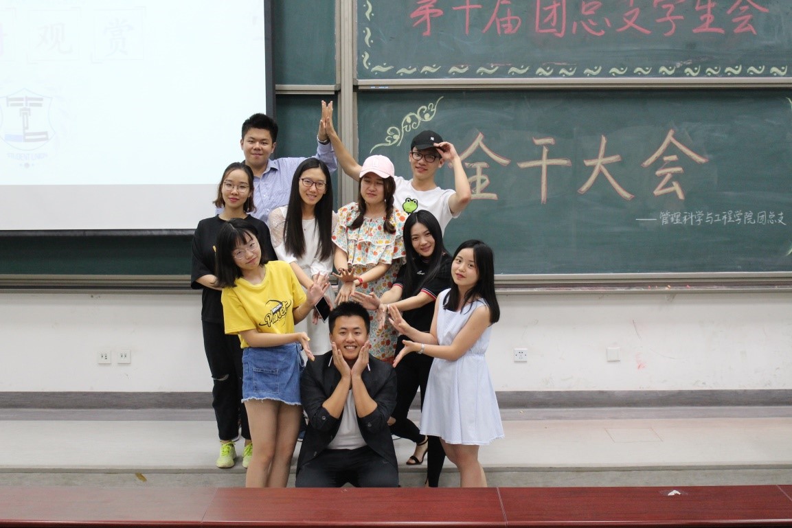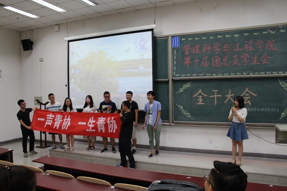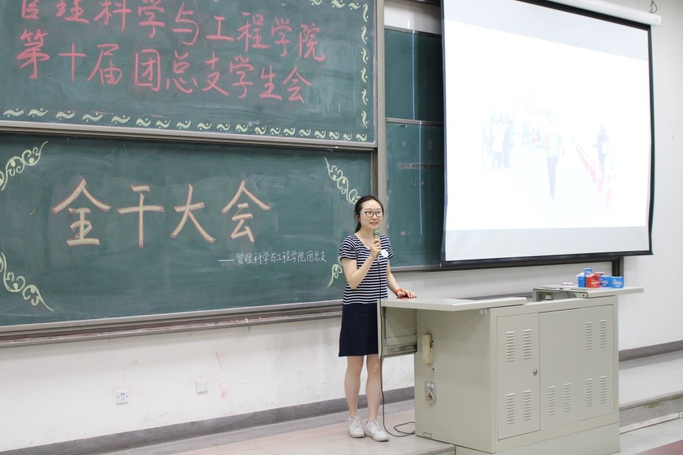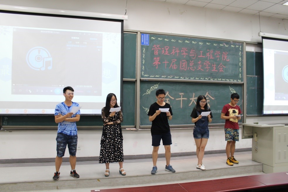 在主持人马铁力风趣幽默的开场过后,第十届主席团代表戴子钧上台发言。他首先提出了一个问题:假如给你一台时光机,让你回到一年前刚刚加入管工员工会的时候,你会做什么——搁下这个问题后,戴子钧展示了一些一年前刚刚进入大学,进入员工会的曾经的“小鲜肉”们当时稚嫩却朴实的感言以及来自学长学姐们的寄语。而后,他又以青协及体育部分管主席的身份对这两个部门的部长干事们传达了自己的叮嘱。说起这一年来在主席团的任职经历,戴子钧感慨万千,值此新老交替的换届之时,他将自己曾经的部长送给自己的“员工会三句诗”送给了台下将继续为了管工员工会奋战下去的各位学弟学妹——