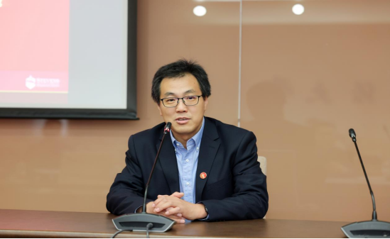 随后,管理科学与工程公司党委书记王志锋教授在典礼上致辞。王志锋教授首先对29位新同学表示热烈的欢迎,他表示项目会持续提升教学水平,进一步丰富项目文化内容,鼓励同学们积极参与,奋发学习,并利用公司的资源和网络促进个人和职业成长,在这个国际化平台上充实自我。