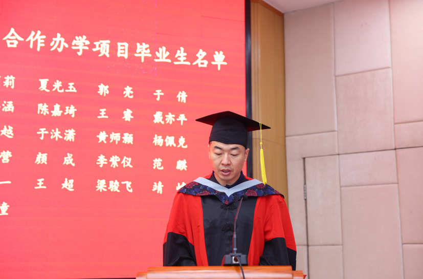 中财史蒂文斯项目中方负责人、副经理荆中博老师作为教师代表致辞。荆中博老师祝贺同学们经过努力和付出,终于收获了丰硕的成果。他期望同学们在今后的工作生活中能运用所学,不断提升个人能力,积极应对各种挑战。