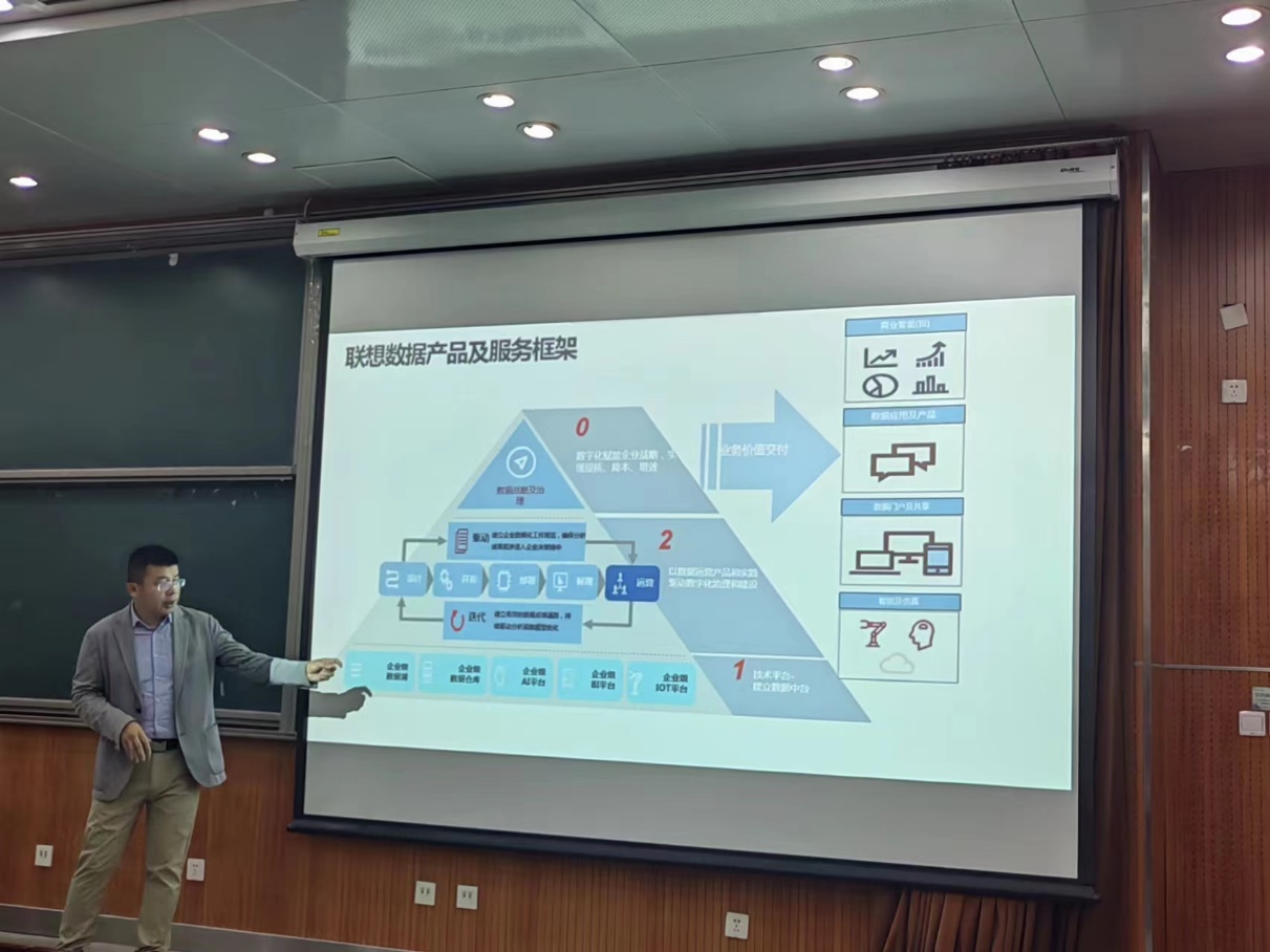 座谈会结束后,与会人员移步公司7号楼115教室,举行企业导师聘任仪式,由刘志东经理为马立志总监颁发许国志大数据英才班企业导师聘书。在之后的讲座中,马立志总监介绍了联想数据战略1.0和2.0两个阶段的建设、联想数据平台建设、数据治理及运营以及大模型等的应用探索。