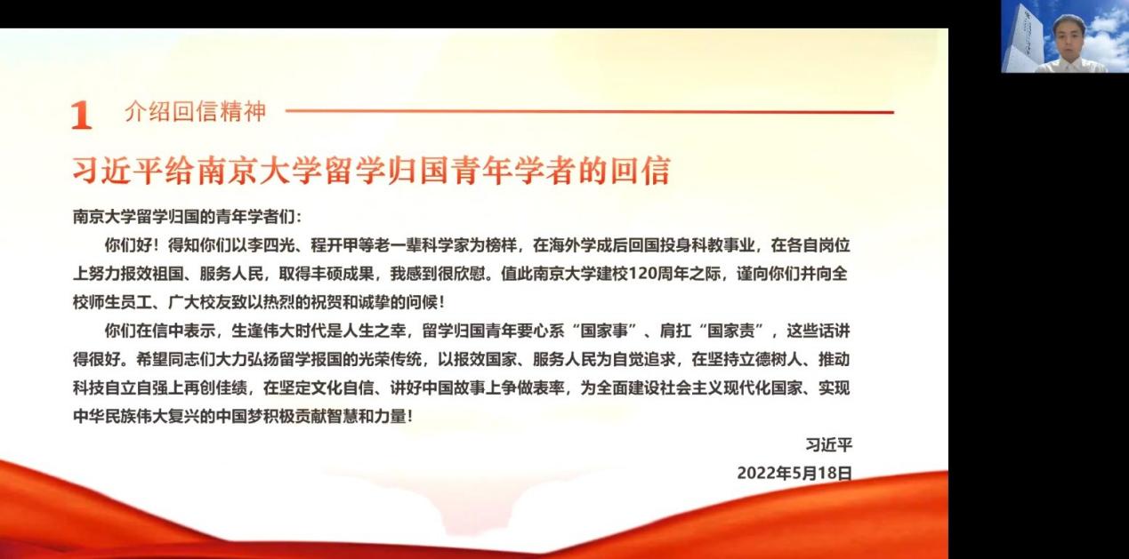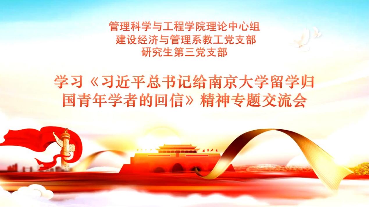 为深入学习贯彻习近平总书记给南京大学留学归国青年学者回信重要精神,增强师生党员对于留学报国光荣传统中的爱国主义精神的理解,2022年6月30日,管理科学与工程公司党委理论中心组、建设经济与管理系教工党支部、研究生第三党支部联合举办了学习《习近平总书记给南京大学留学归国青年学者的回信》精神专题交流会。本次交流会由研究生第三党支部书记蒋博文主持。