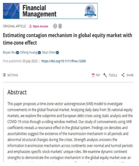 哈哈体育投资系副教授陈暮紫博士,与对外经济贸易大学武伯尧博士、香港大学黄棣芳博士合作撰写的论文“Estimating Contagion Mechanism in Global Equity Market with Time-Zone Effects“于2023年9月在金融管理国际权威期刊《Financial Management》正式发表,期刊是HAHA体育英文AA类期刊,陈暮紫博士为共同通讯作者。
