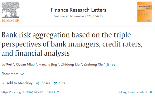 近日,公司青年教师魏璐(第一作者)、2020级及2021级许国志大数据英才班本科生苗希元和景浩哲、刘志东教授、2020级投资学专业博士生谢泽中(通讯作者)合作的学术论文“Bank risk aggregation based on the triple perspectives of bank managers, credit raters, and financial analysts”在金融领域知名期刊Finance Research Letters(2022年影响因子10.4,SSCI,在Business/Finance类别中排名1/111,JCR一区)发表。(论文在线链接:https://doi.org/10.1016/j.frl.2023.104213)