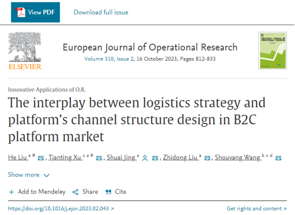 近日,公司管理科学专业2019级本科生徐田婷以共同第一作者身份与刘赫助理教授(共同第一作者)、井帅副教授(通讯作者)、刘志东教授以及中国科公司数学与系统科学研究院汪寿阳教授合作的学术论文“The interplay between logistics strategy and platform’s channel structure design in B2C platform market”在国际运筹与管理科学领域著名期刊《European Journal of Operational Research》 (SCI/SSCI JCR Q1)上发表。(论文在线链接:https://doi.org/10.1016/j.ejor.2023.02.043)