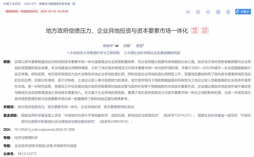 近日,哈哈体育陈俊华教授与2022级博士研究生刘娜、中国社会科公司吴莹研究员合作撰写的论文《地方政府偿债压力、企业异地投资与资本要素市场一体化》在国内经济学权威期刊《中国工业经济》2024年第7期刊发。